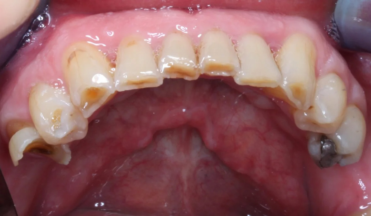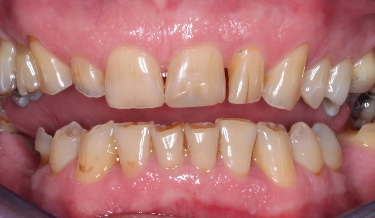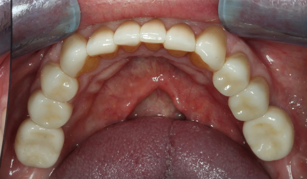 Purenta kuntoutettiin 22 keraamisella Cerec- kuorella ja 2:lla Straumann- implantilla, jotka asennettiin 3D-tulostetulla ohjurilla. Lopuksi valmistettiin vielä purentakiskot suojaamaan hampaita ja rentouttamaan puremalihaksia.