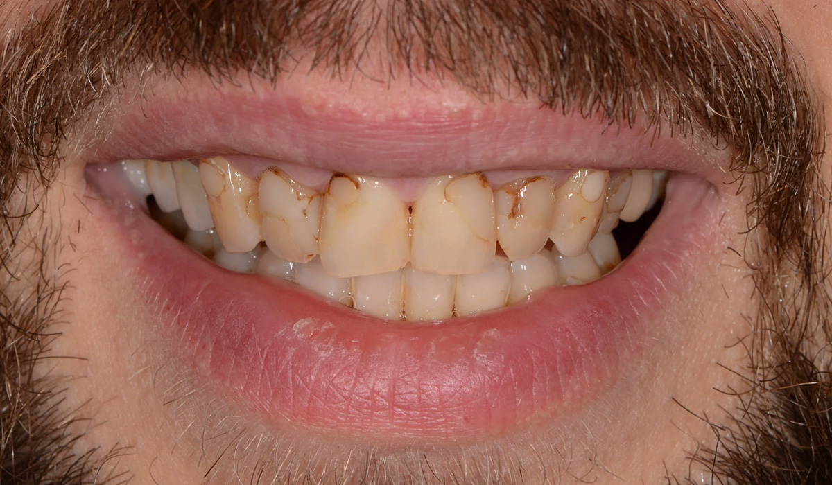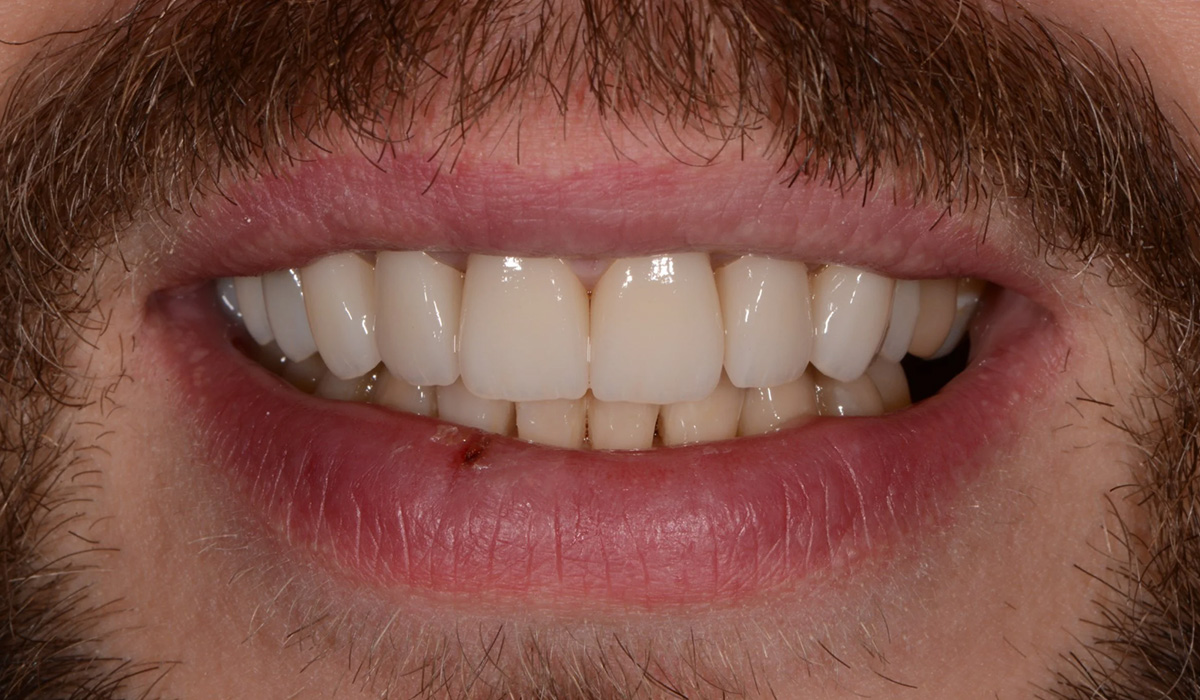Tomi toivoi hoidolta estetiikan ja toiminallisuuden parantamista. Hoito koostui kalvo-oikomisesta, aiemman keraamisen sillan uusimisesta, kuuden yläetuhampaan korjaamisesta keraamisilla kruunuilla ja kahden hampaan korvaamisesta hammasimplanttikruunuilla. Hoito kesti kokonaisuudessaan noin 12 kuukautta.
